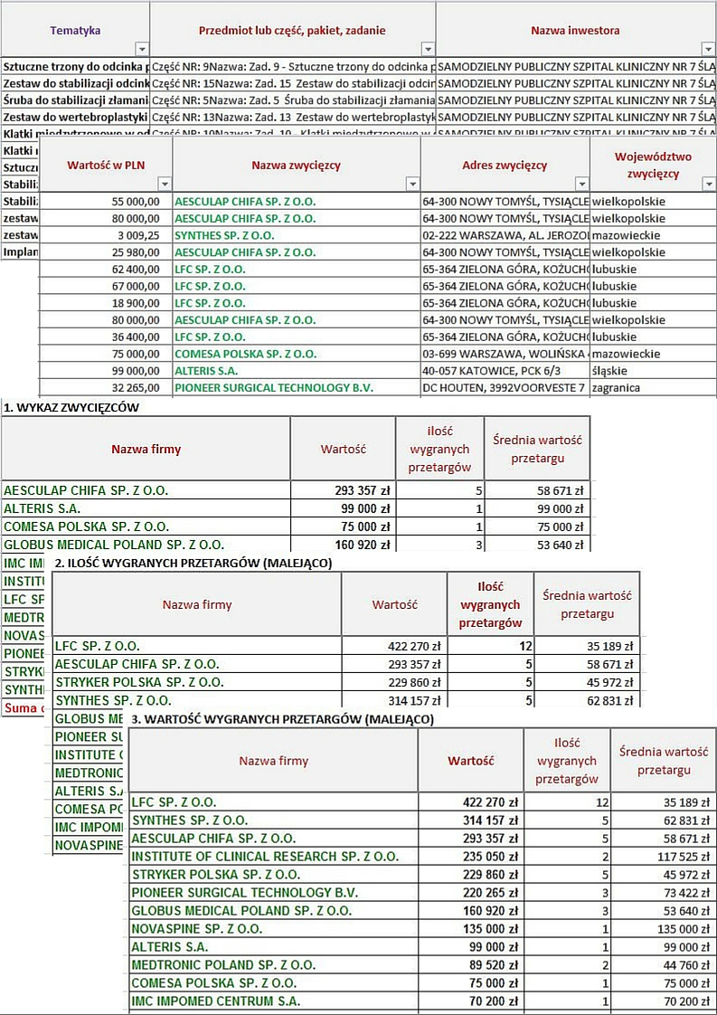Analizie poddaliśmy wyniki przetargów, a dokładniej części, pakiety, zadania dotyczące (jak ogólnie to określiliśmy dla potrzeb opracowania) implantów kręgosłupowych.